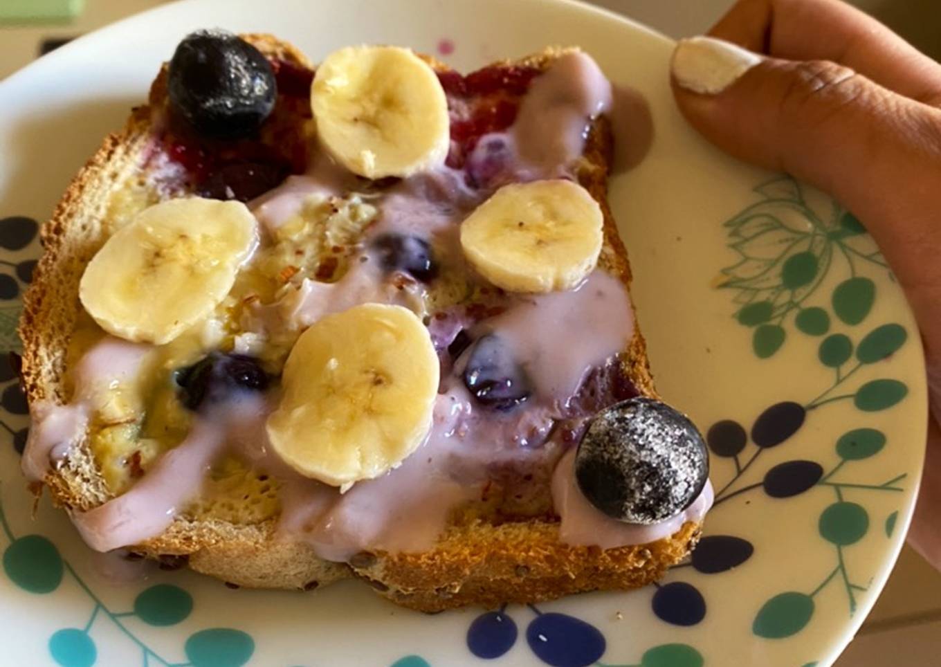 - Agrega la mezcla sobre el hueco del pan y agrega algunas frutas de tu preferencia (yo agregué arándanos y plátano).