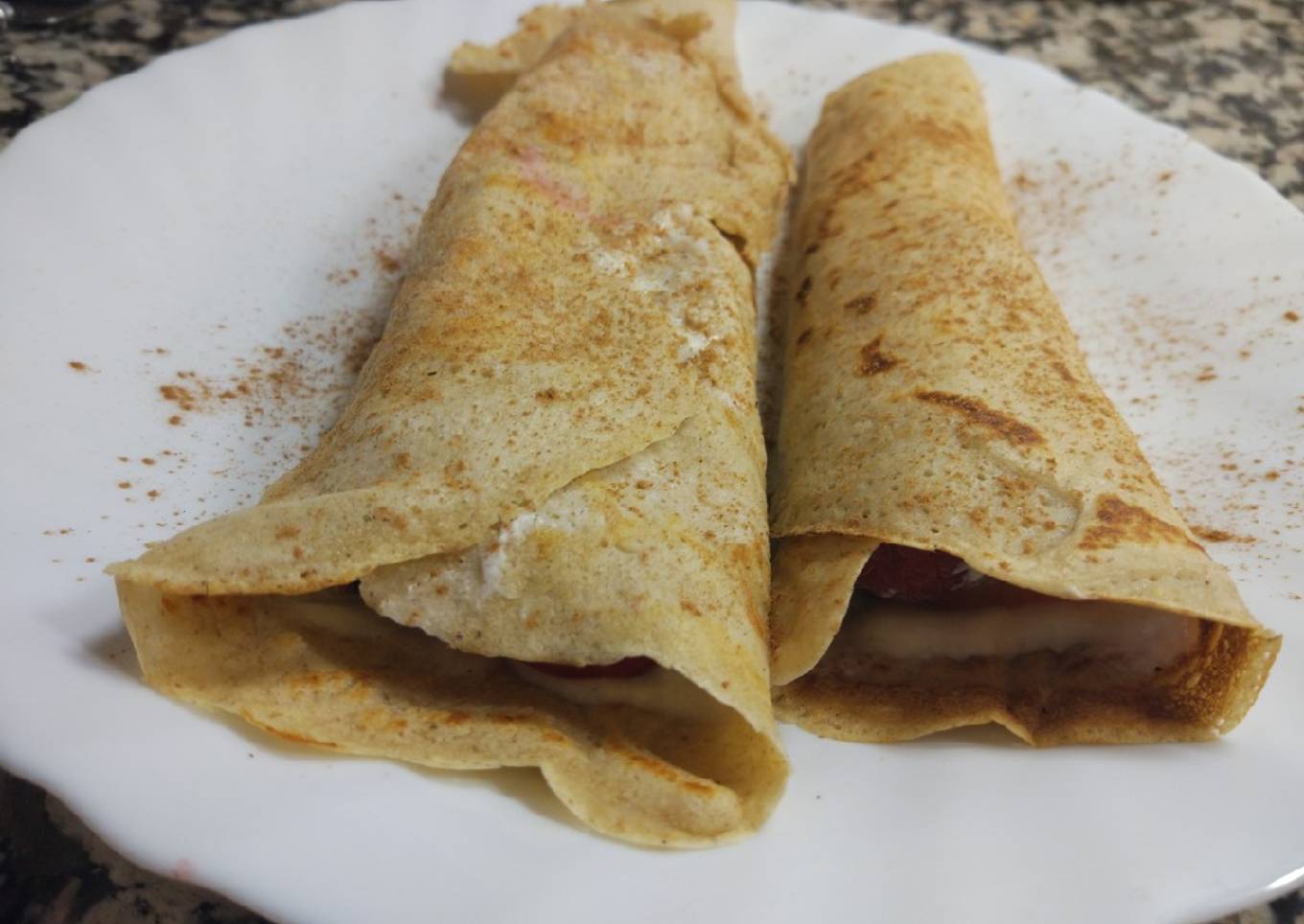 - Con cada crep ponemos un poquito de yogur extendiendo y luego la fruta que queramos cortada en medio, hacemos un rollito y servimos.